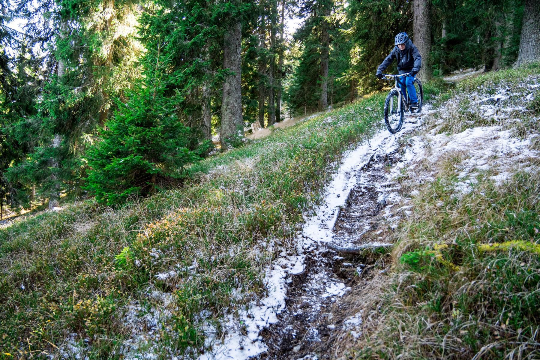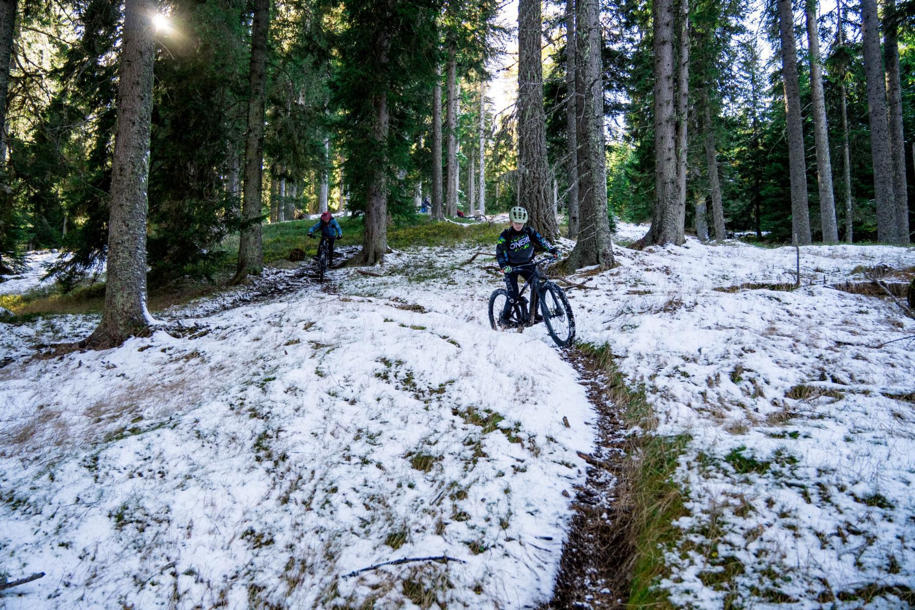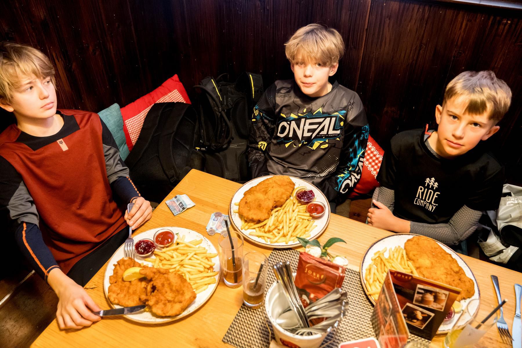 Am Gipfel erwarteten uns frischer Schnee und kalte Temperaturen, was die Kinder sofort begeisterte. Das Biken im Schnee fühlte sich wie ein kleines Abenteuer in einer völlig anderen Welt an. Nach einer ersten kurzen Trailabfahrt über etwa 400 Höhenmeter am Vormittag kehrten wir zum Mittagessen in einer Hütte ein. Die Kinder waren inzwischen sehr hungrig, und da in der Hütte viel los war, mussten wir eine extrem lange Wartezeit in Kauf nehmen. Am Ende bekamen alle etwas zu essen von Kaiserschmarrn über Germknödel und andere warmen Gerichte.