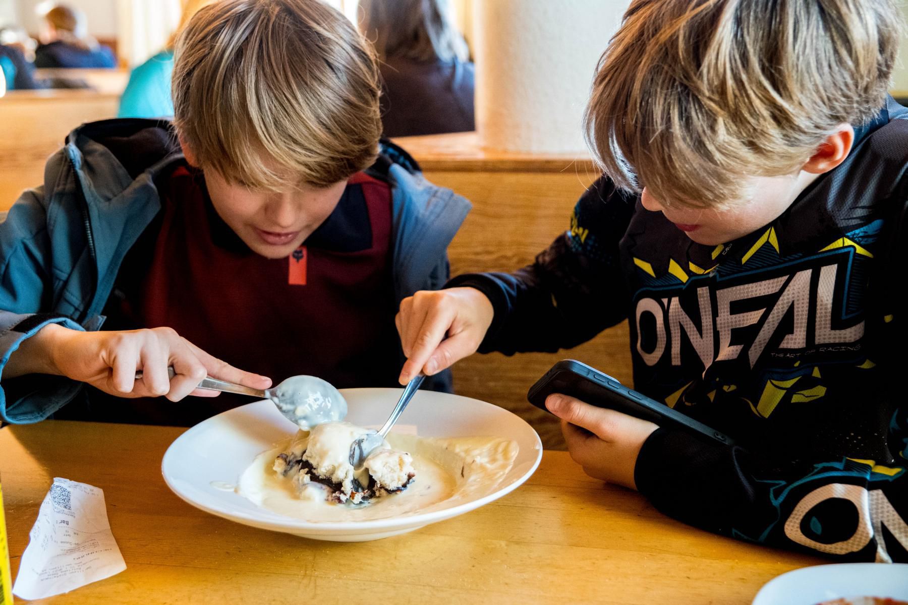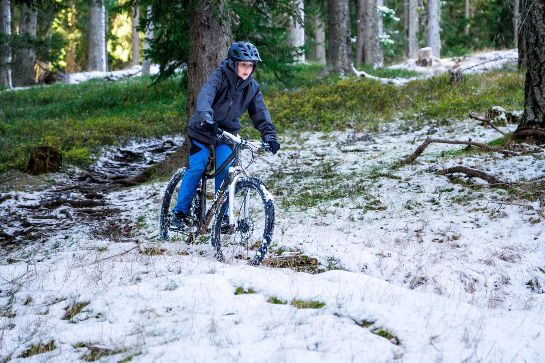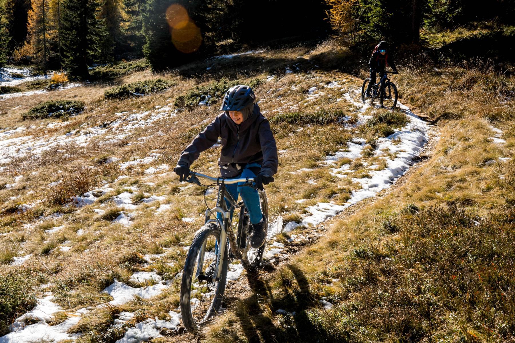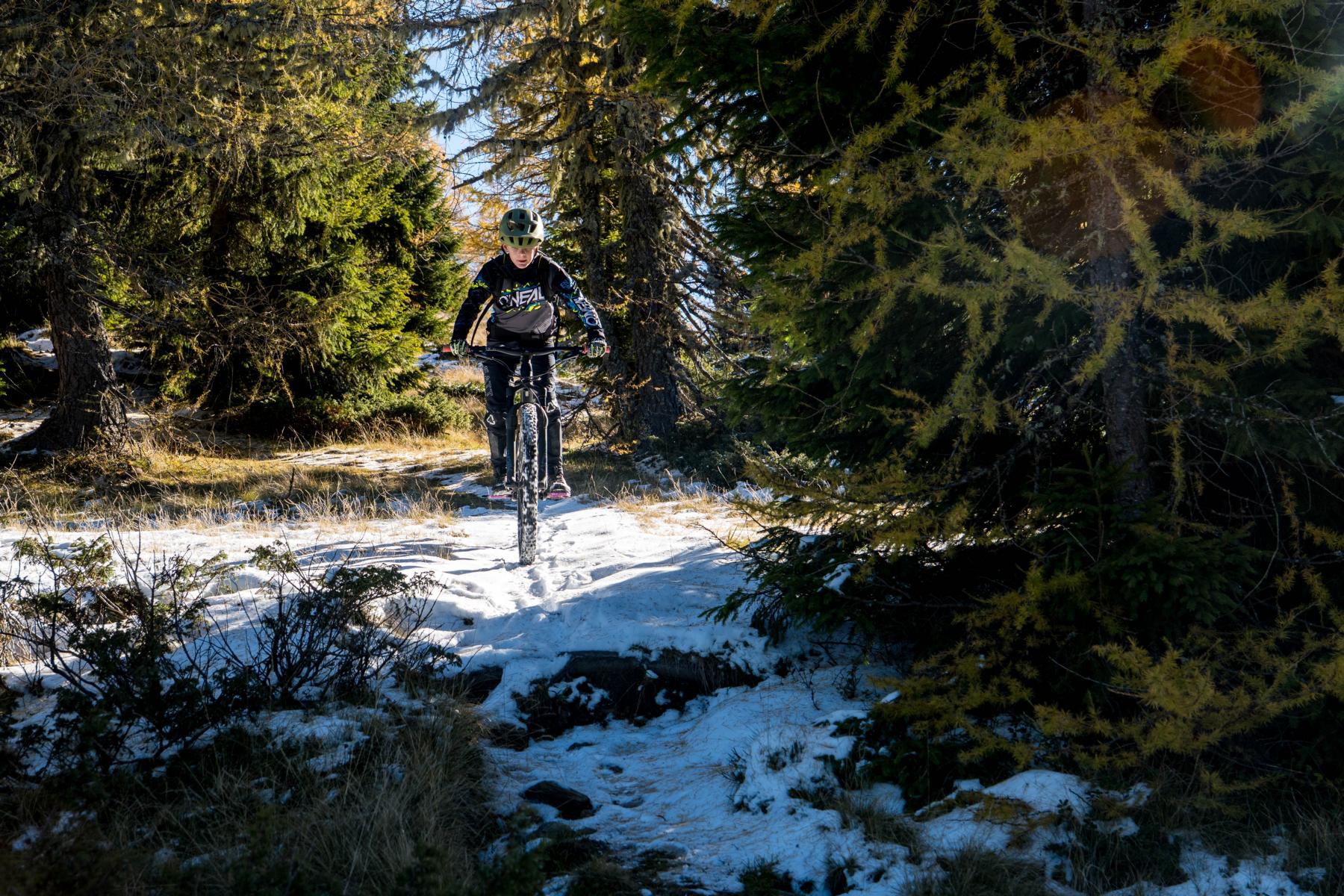 Am Gipfel erwarteten uns frischer Schnee und kalte Temperaturen, was die Kinder sofort begeisterte. Das Biken im Schnee fühlte sich wie ein kleines Abenteuer in einer völlig anderen Welt an. Nach einer ersten kurzen Trailabfahrt über etwa 400 Höhenmeter am Vormittag kehrten wir zum Mittagessen in einer Hütte ein. Die Kinder waren inzwischen sehr hungrig, und da in der Hütte viel los war, mussten wir eine extrem lange Wartezeit in Kauf nehmen. Am Ende bekamen alle etwas zu essen von Kaiserschmarrn über Germknödel und andere warmen Gerichte.