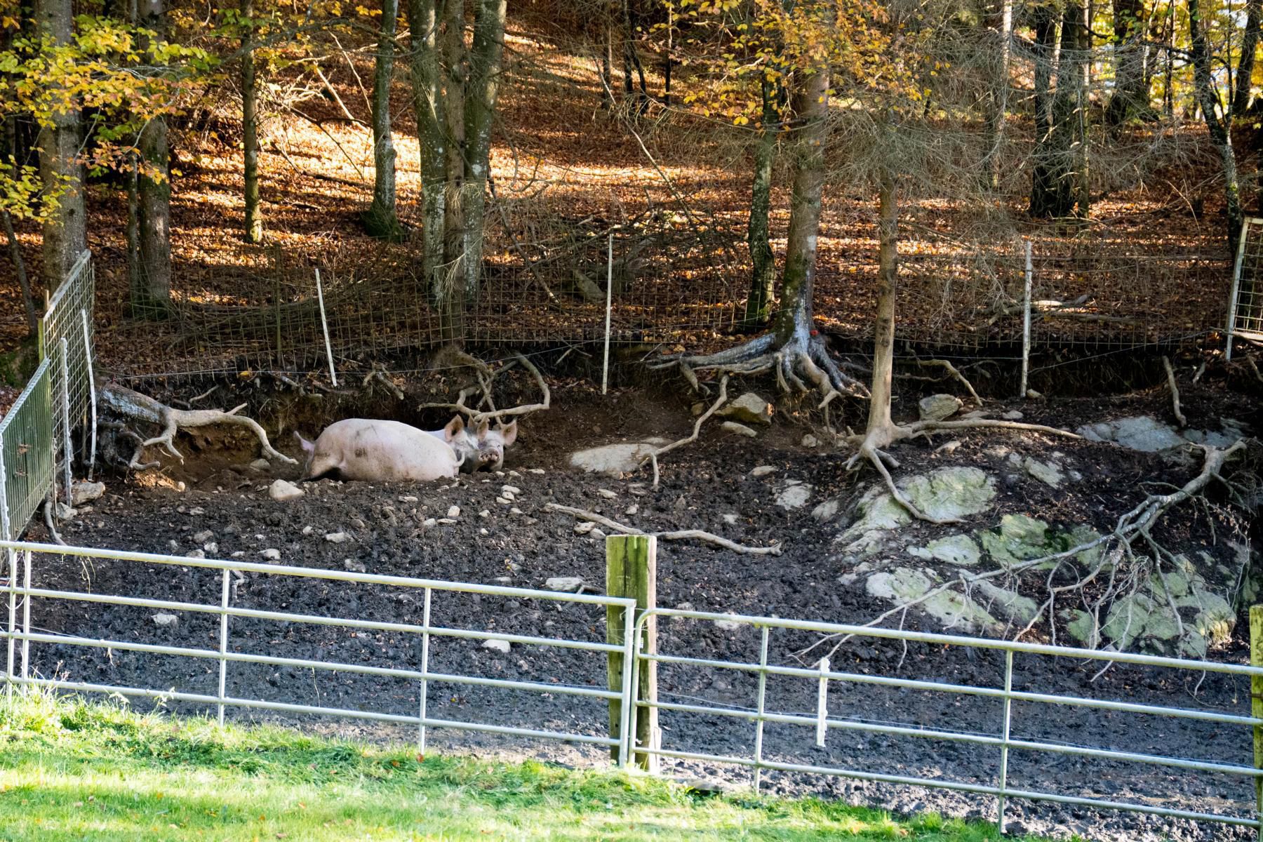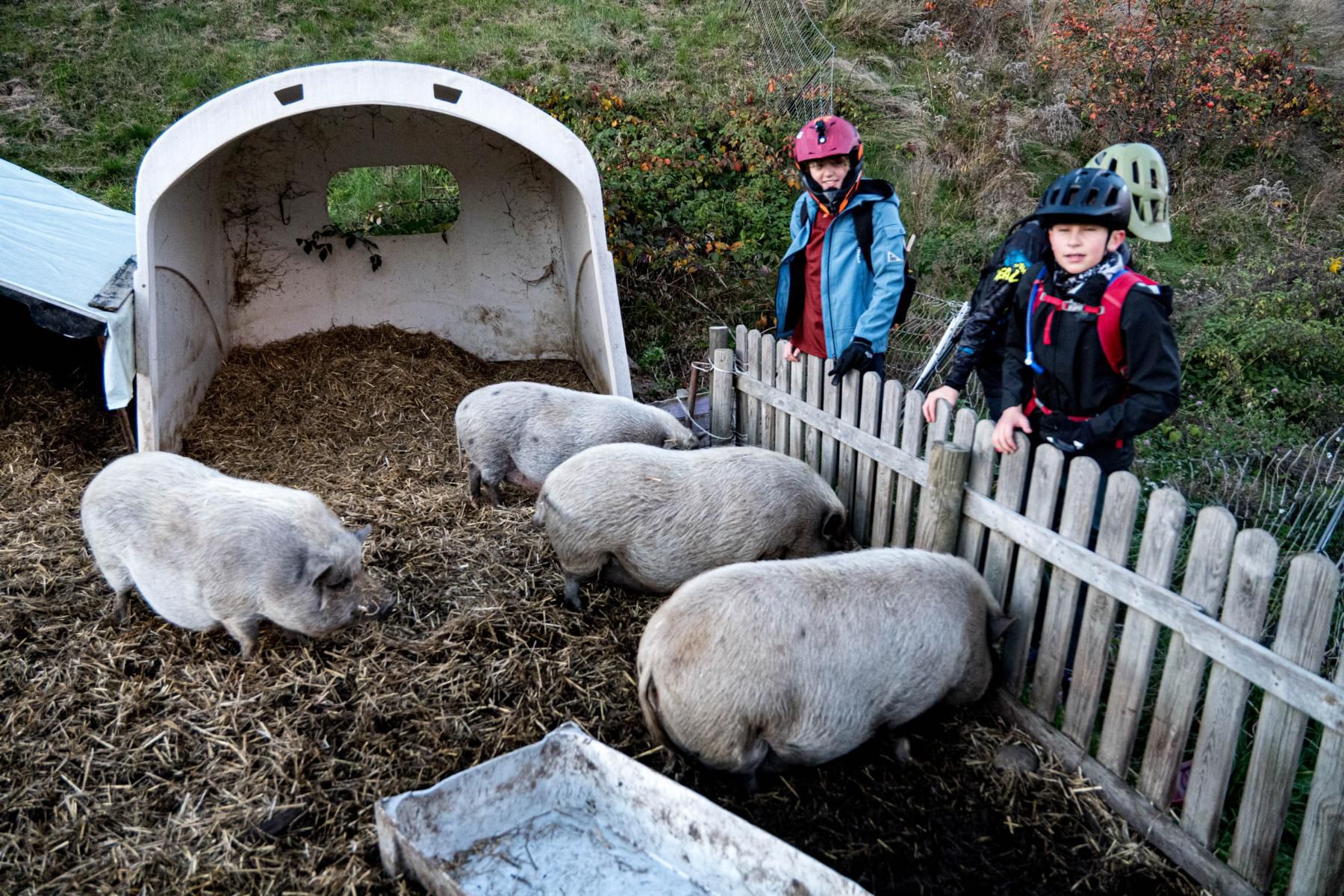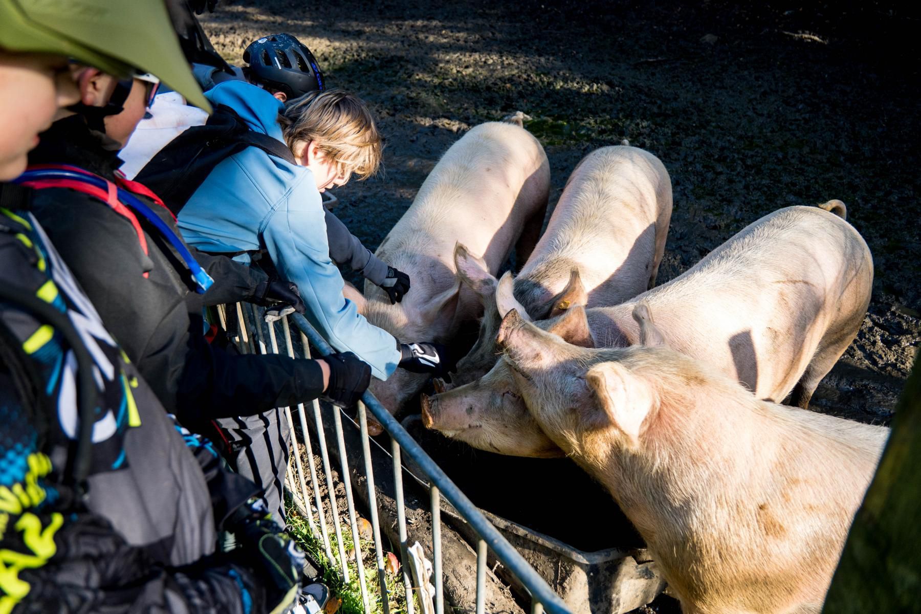 Auf dem Weg kamen wir an einem Bauernhof vorbei. Nach einem kurzen Gespräch mit der Bäuerin durften wir die freilaufenden Schweine besuchen. Als sich die Kinder am Zaun aufreihten, stürmte die Gruppe großer, neugieriger Schweine laut grunzend heran. Die Begegnung zwischen den aufgeweckten Kindern und den ebenso neugierigen Tieren war faszinierend. Die Neugier war eindeutig beidseitig, die Unsicherheit allerdings nur auf einer Seite des Zauns.