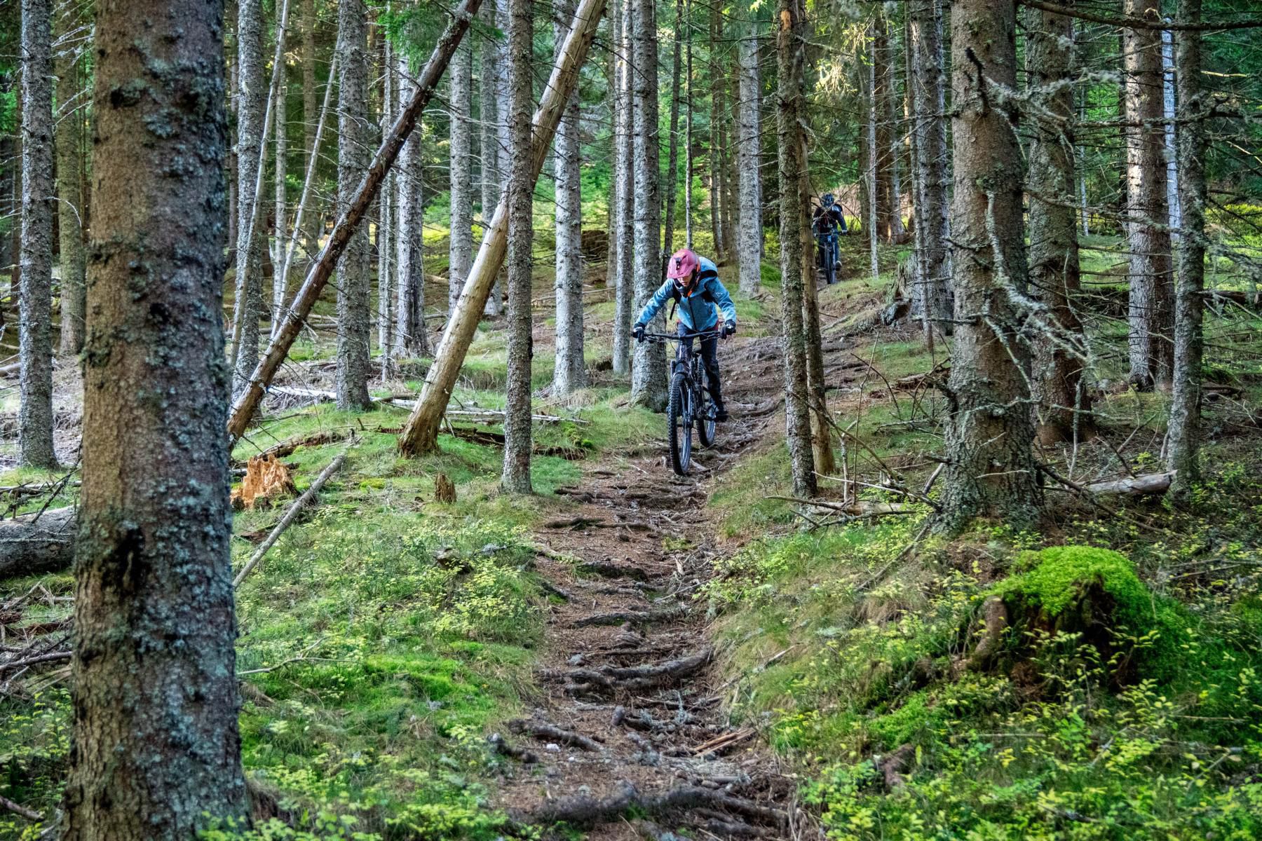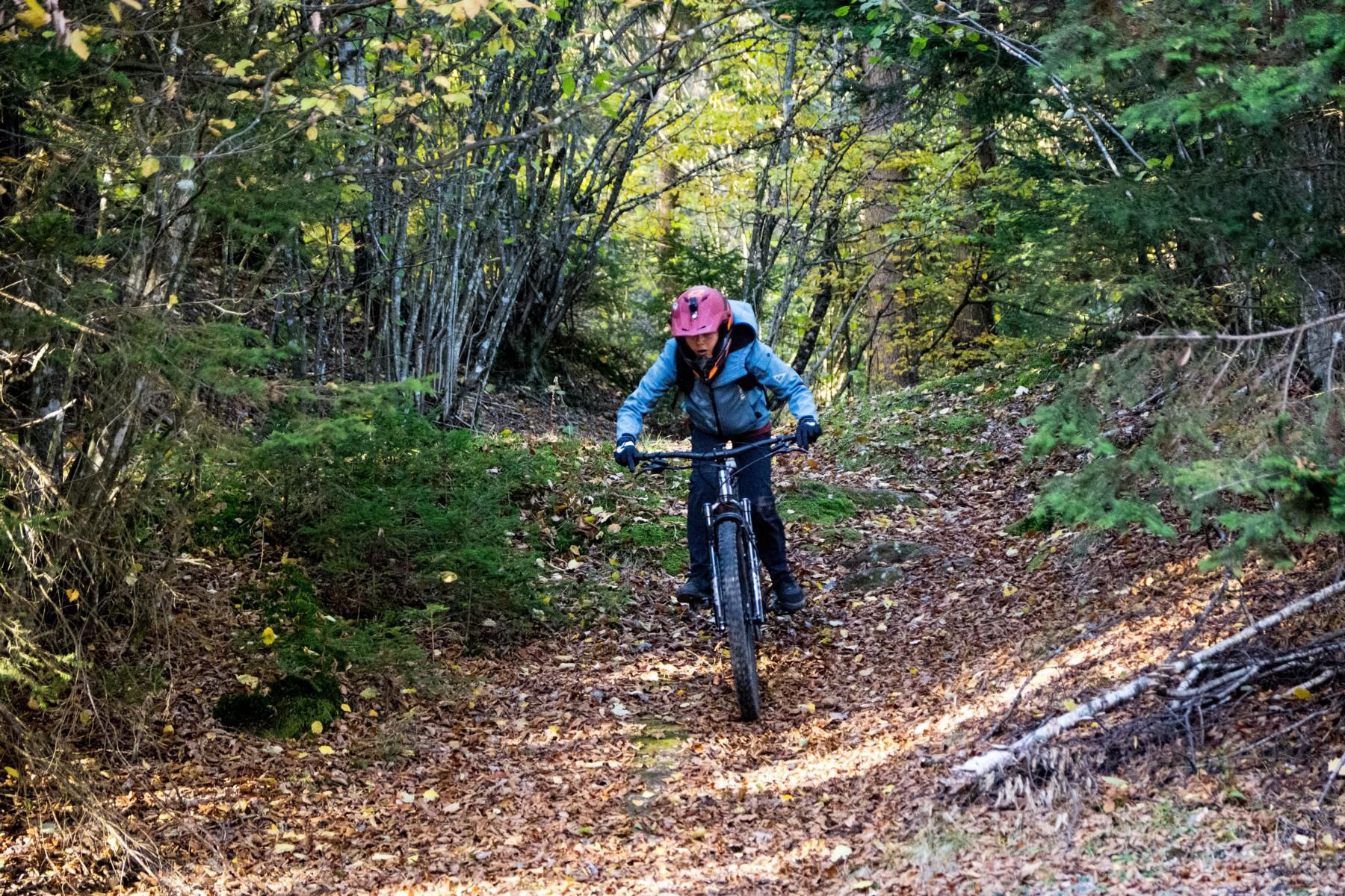 Am zweiten Tag standen beeindruckende 2100 Tiefenmeter auf unterschiedlichsten Singletrails auf dem Programm. Rund 1800 Höhenmeter legten wir bergauf mit technischer Unterstützung zurück. Dennoch wurde es ein vollwertiger und intensiver Tourentag. Insgesamt traten die Kinder stolze 300 Höhenmeter aufwärts und rund 35 Kilometer selbst in die Pedale und meisterten zusätzlich 2100 Tiefenmeter auf einfachen, flowigen, wurzeligen und steinigen Singletrails. Dieses Mal hatte der Guide kein Light-E-MTB dabei und zog die Kinder auch nicht den Berg hinauf.