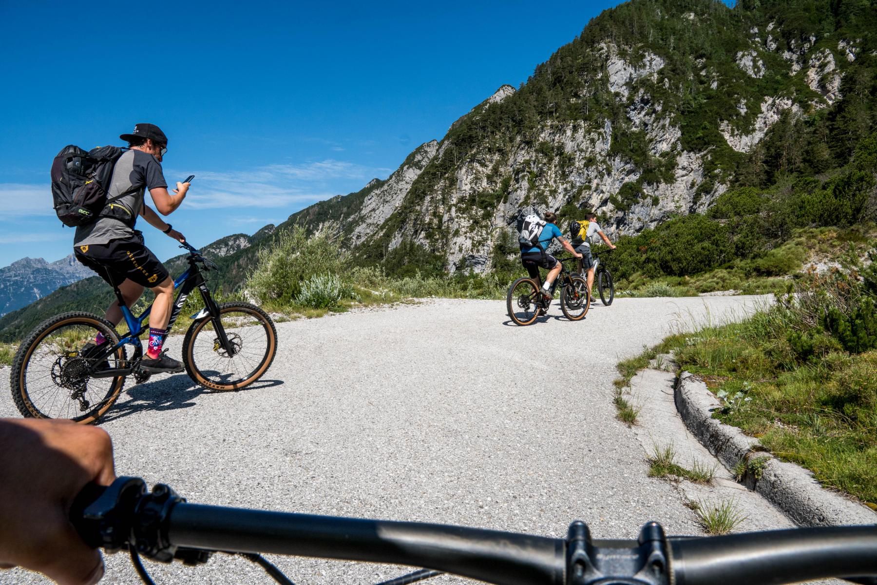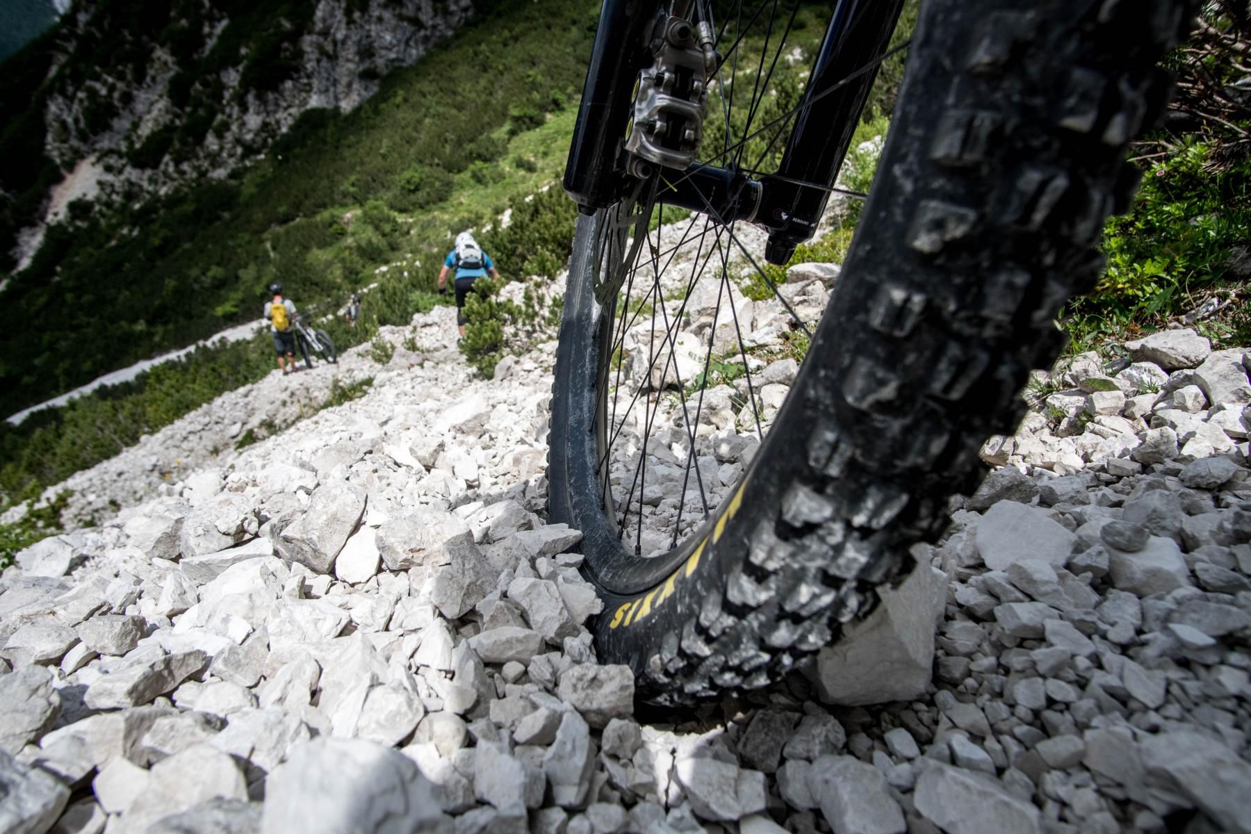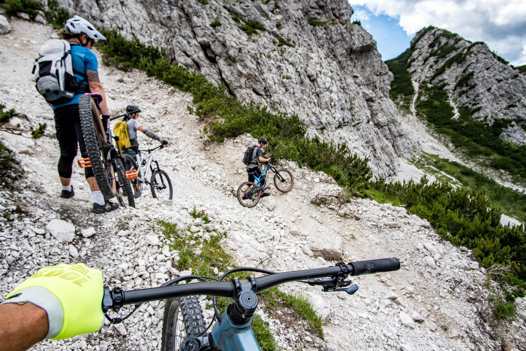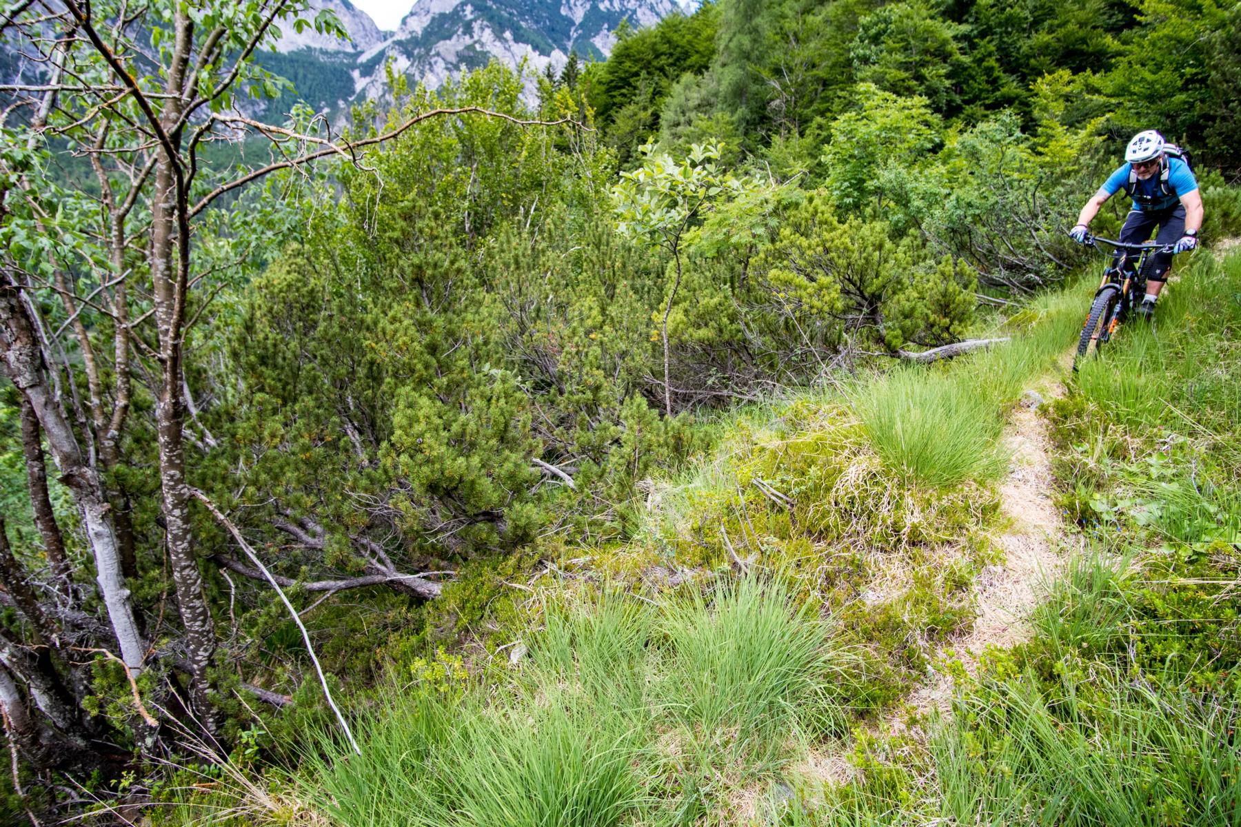 Der Einstieg in den Trail ist ein Traum. Bergpanorama, schmale Trails, alpine Stimmung. Der Trail ist überwiegend S2, gespickt mit einigen S3- und sogar S4-Stellen. Steinig, fordernd, ehrlich. Wir schlängeln uns durch die Latschen, einfache Spitzkehren wechseln sich mit technischen und flowigen Passagen ab. Muskeln und Konzentration sind voll gefordert. Aber genau das macht den Reiz aus. Jede gemeisterte Schlüsselstelle fühlt sich wie eine kleine Belohnung an. So soll Mountainbiken im Gebirge sein: anspruchsvoll, aber fair.