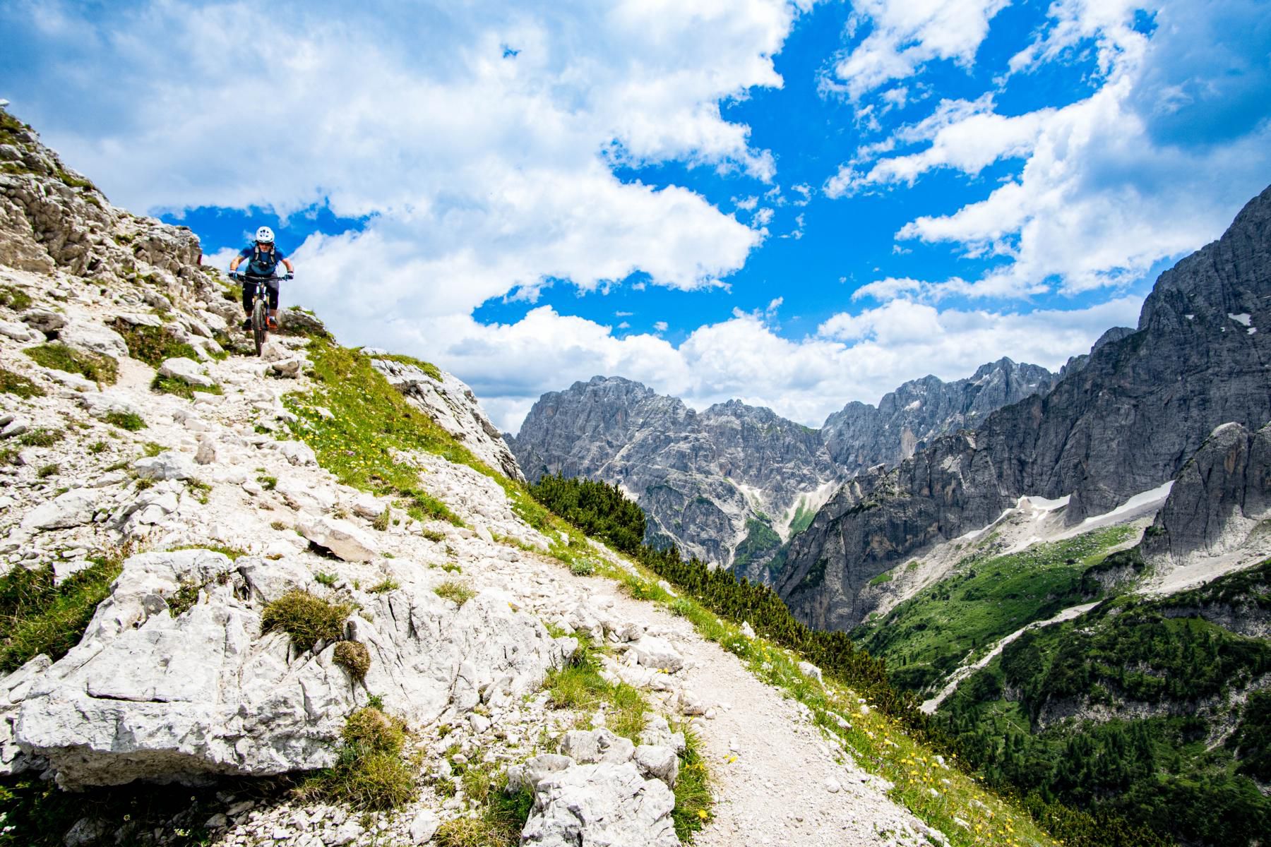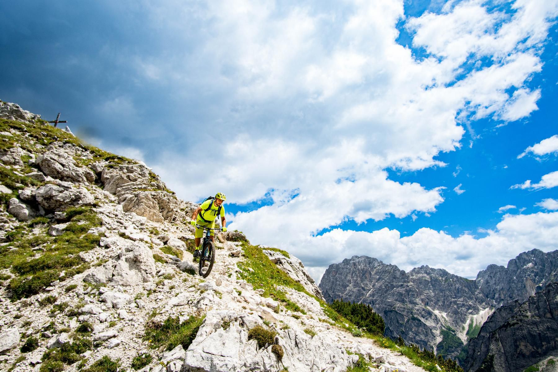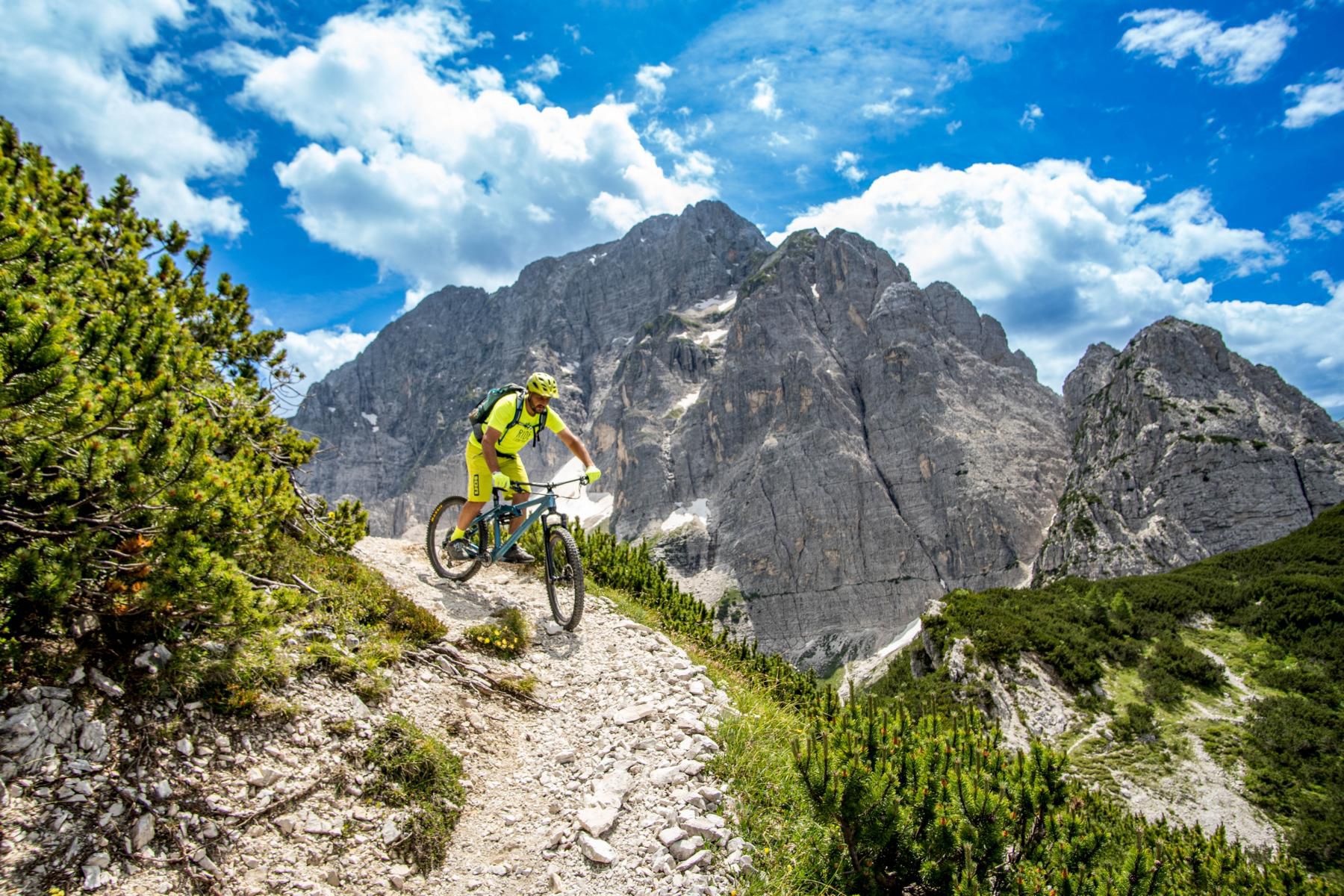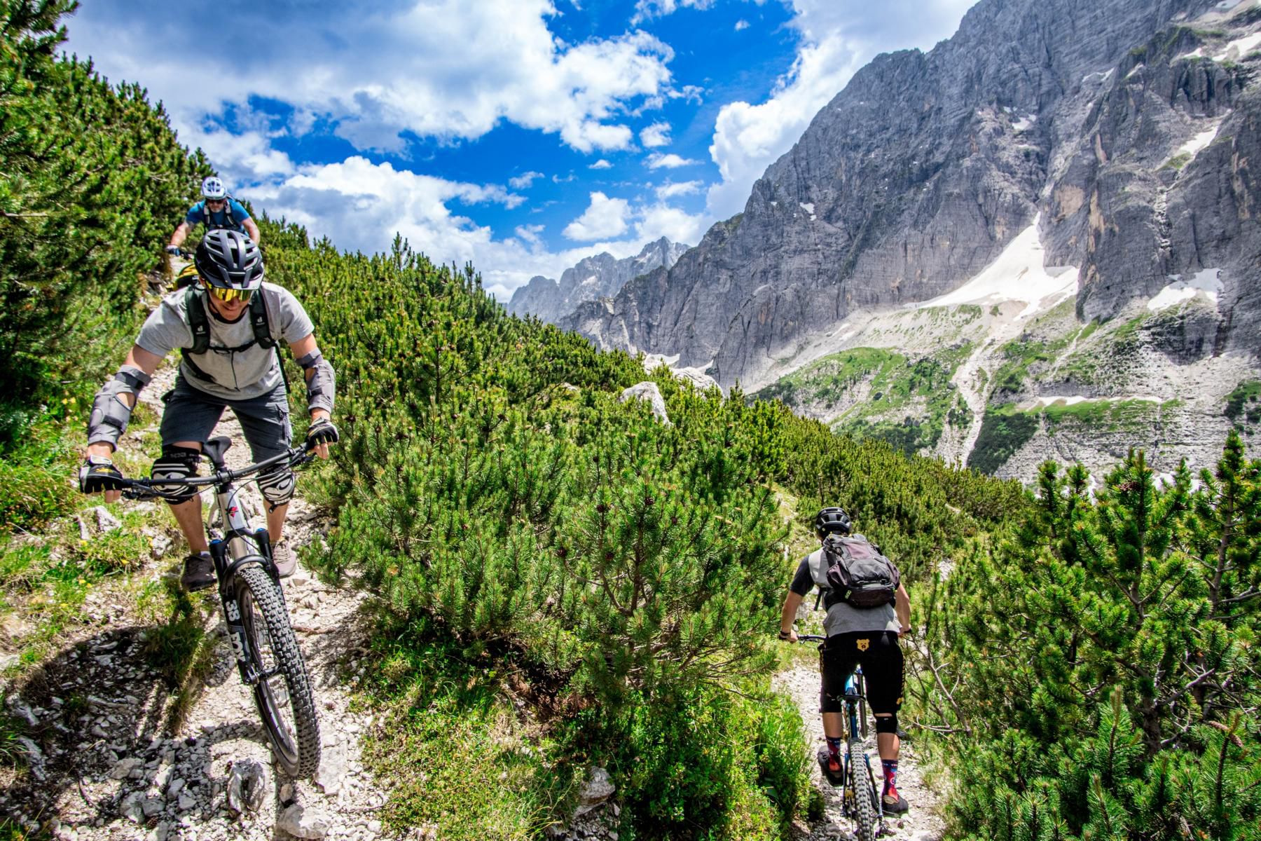 Der Einstieg in den Trail ist ein Traum. Bergpanorama, schmale Trails, alpine Stimmung. Der Trail ist überwiegend S2, gespickt mit einigen S3- und sogar S4-Stellen. Steinig, fordernd, ehrlich. Wir schlängeln uns durch die Latschen, einfache Spitzkehren wechseln sich mit technischen und flowigen Passagen ab. Muskeln und Konzentration sind voll gefordert. Aber genau das macht den Reiz aus. Jede gemeisterte Schlüsselstelle fühlt sich wie eine kleine Belohnung an. So soll Mountainbiken im Gebirge sein: anspruchsvoll, aber fair.
