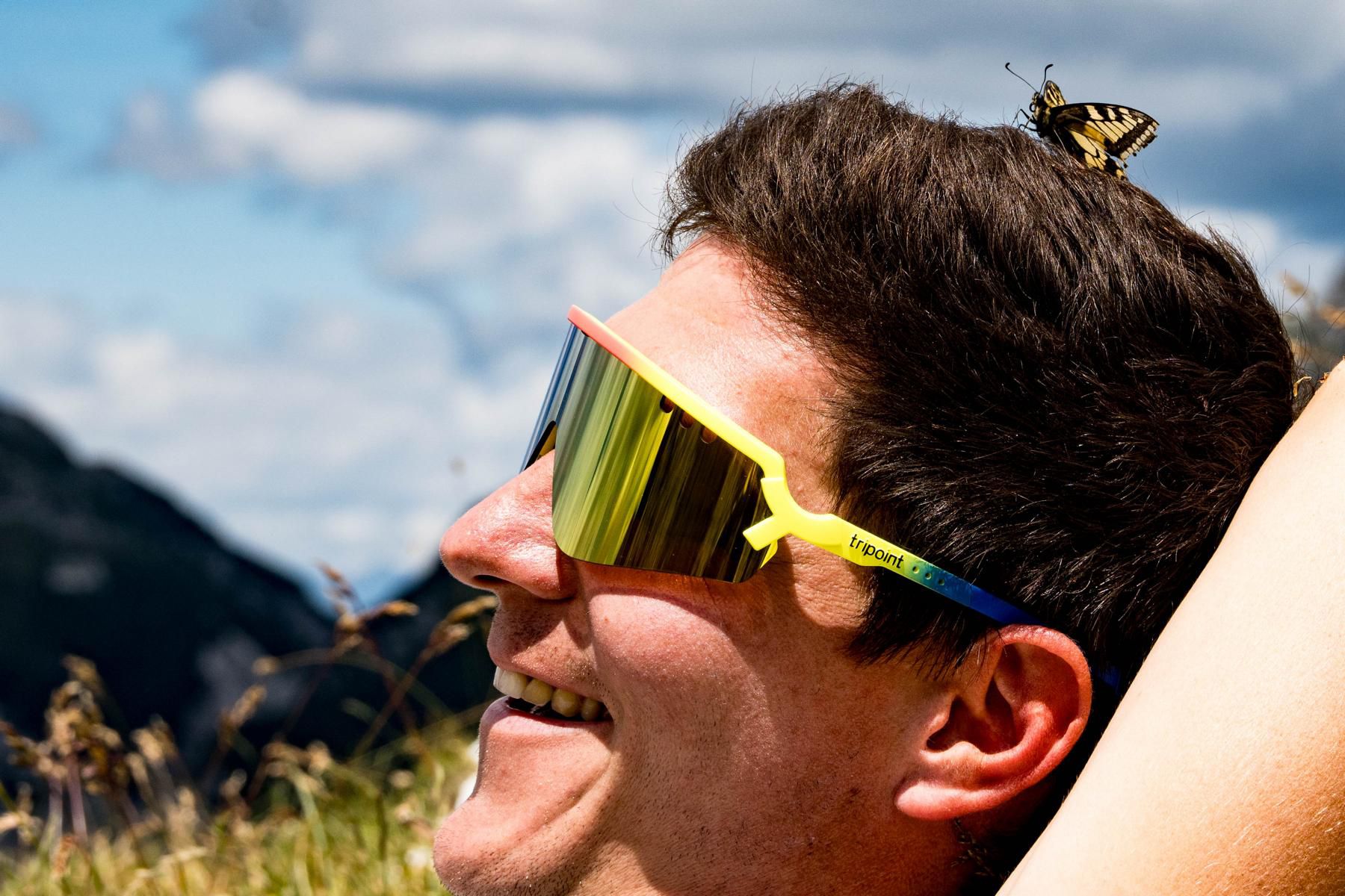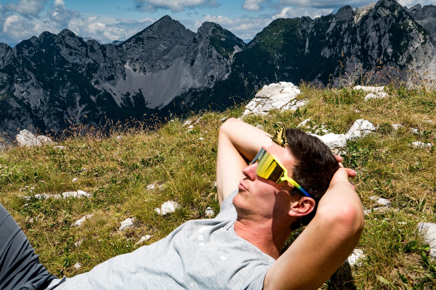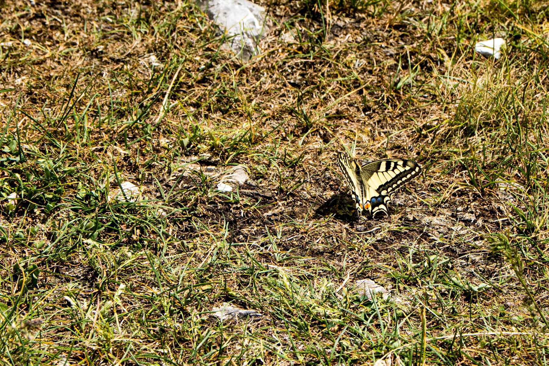 Dann landet er. Ein Schwalbenschwanz-Schmetterling. Immer wieder kommt er zurück, über mehr als 30 Minuten hinweg besucht er immer wieder nur Christopher. Wahrscheinlich wegen seiner stylischen Brille. Schlussendlich gelingt endlich der fast perfekte Schnappschuss vom haarigen Landeplatz des Schmetterlings. Plötzlich kommt ein zweiter Schmetterling dazu, und die beiden tanzen wild und akrobatisch über uns in die Lüfte. Ein stilles und beeindruckendes Schauspiel in der klaren Bergluft.