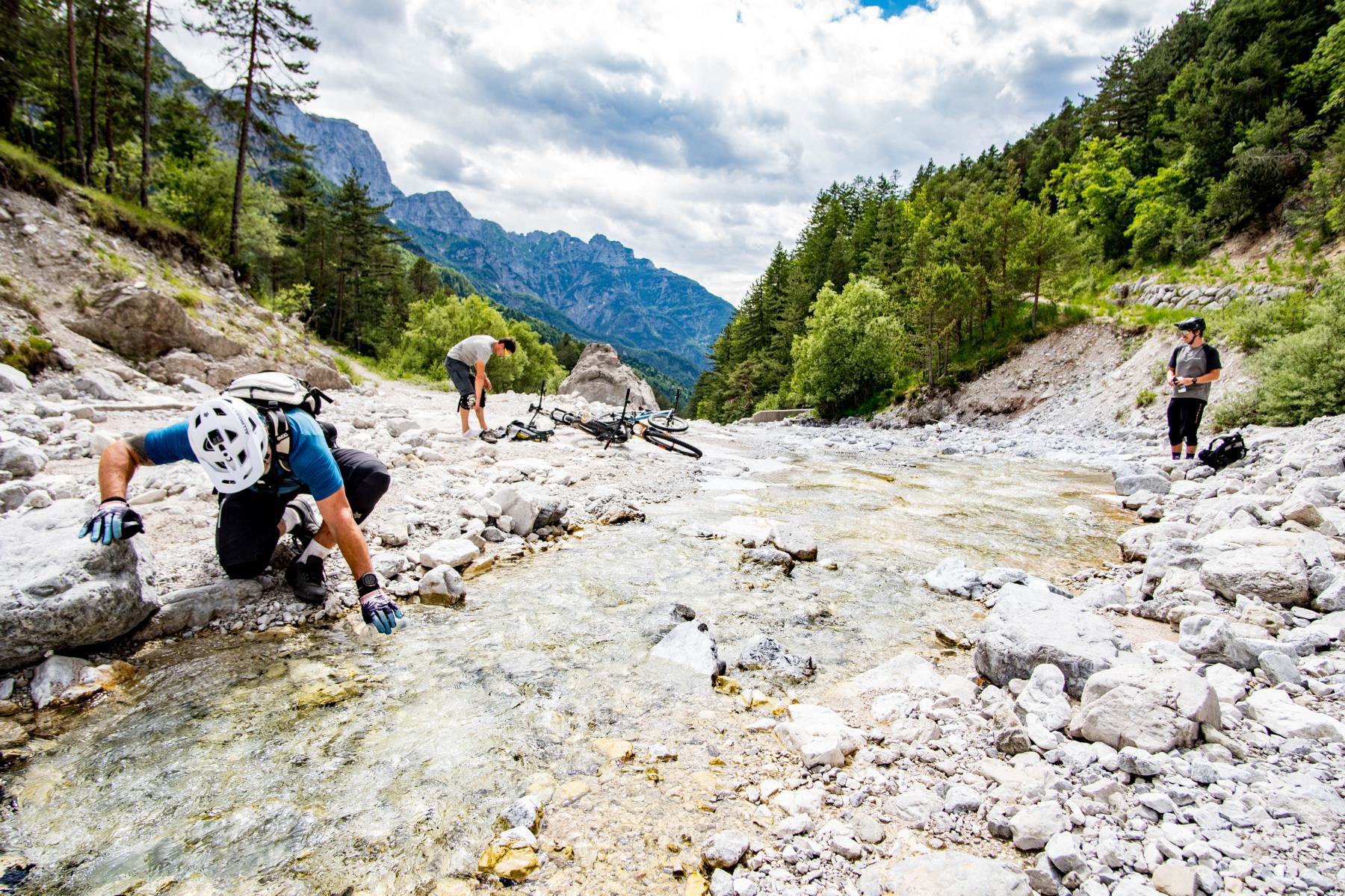 Wie erwartet müssen wir kurz tragen und schieben, um eine Scharte zu erreichen. Das ist eingeplant. Was dann kommt, nicht. Plötzlich ein neuer, wunderschöner kurzer Singletrail-Abschnitt. Danach ein Geröllfeld – überraschend, aber vieles davon ist fahrbar. Nicht jeder schafft alles, aber jeder probiert es. Der Spaß steht klar im Vordergrund. Und dann passiert es: Ein endlos scheinender, flowiger Singletrail zieht sich talwärts. S1, S2, flüssig, verspielt, einfach nur genial. Keiner kann es glauben. Der Trail trägt uns bis zu einem Fluss im Tal. Dort trinken wir alle das glasklare und eiskalte Wasser direkt aus dem Bach, da einigen bei der Tour das Wasser ausgeht und wir unser Wasser gemeinsam aufteilen. Von hier sind es nur noch fünf Minuten zu den Autos. Ein perfektes Ende für ein echtes Abenteuer.