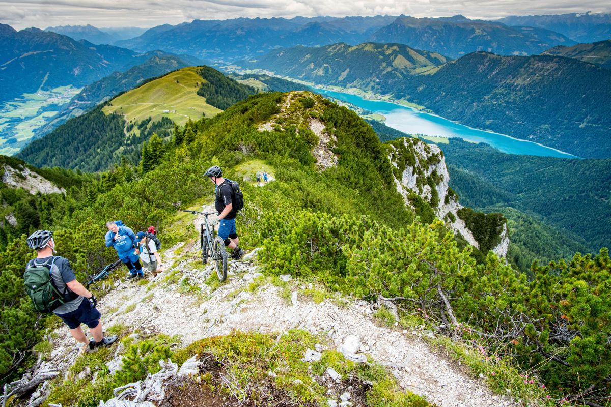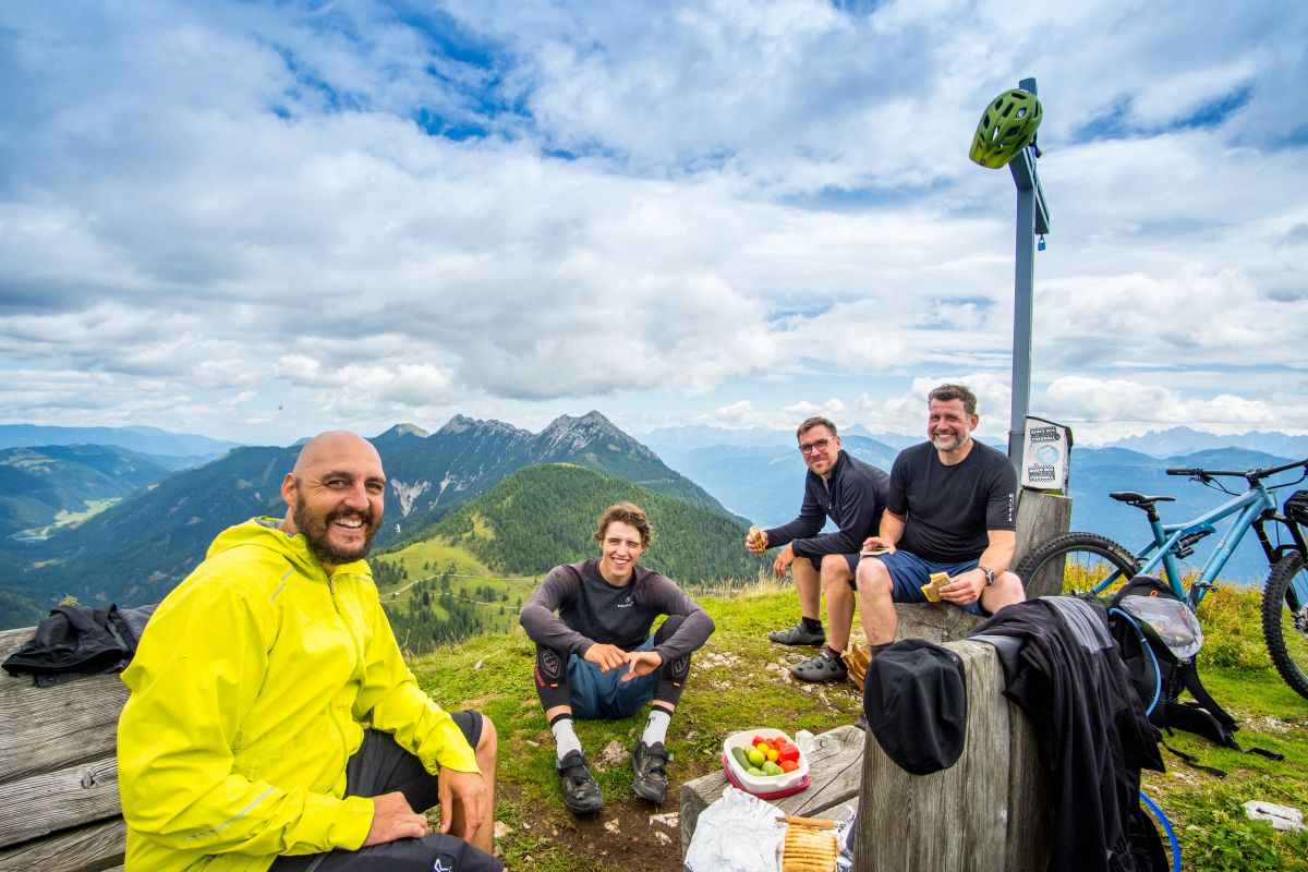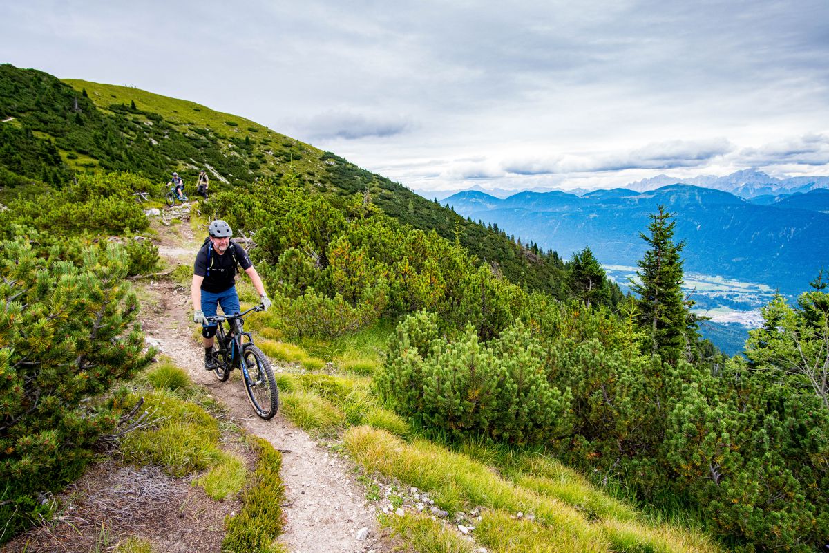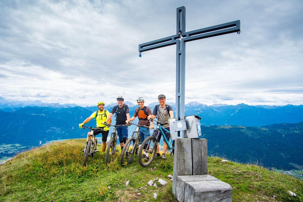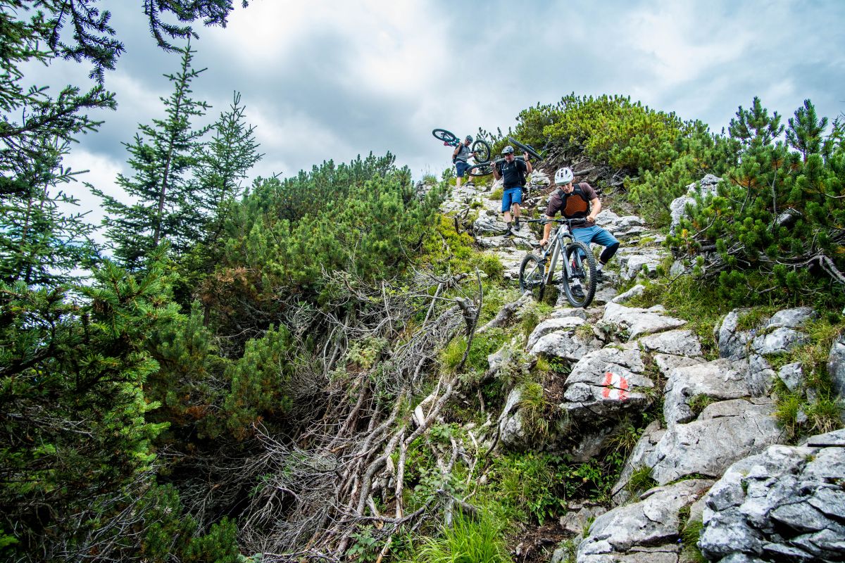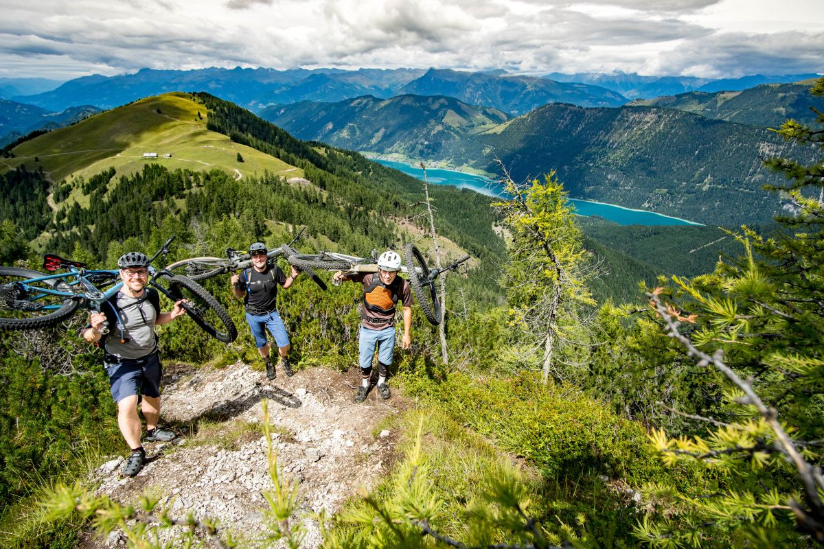 Bei dieser Bikebergsteigen light Tour nutzen wir zuerst einen Lift mit Biketransport, danach traten wir fleißig in die Pedale und schlussendlich mussten wir unsere Mountainbikes schultern. Soweit so geplant. Bei der Tragepassage auf den Gipfel entpuppten sich einige Stellen als sehr steil. Kondition und Trittsicherheit mit den Bikes auf den Schultern waren gefragt. Auch ein umgefallener Baum quer über den Weg hat uns aber nicht aufgehalten und wir meisterten dies gemeinsam. Alle Wanderer die wir getroffen haben waren sehr interessiert an uns und neugierig, was wir da eigentlich machten und wünschten uns alles Gute.