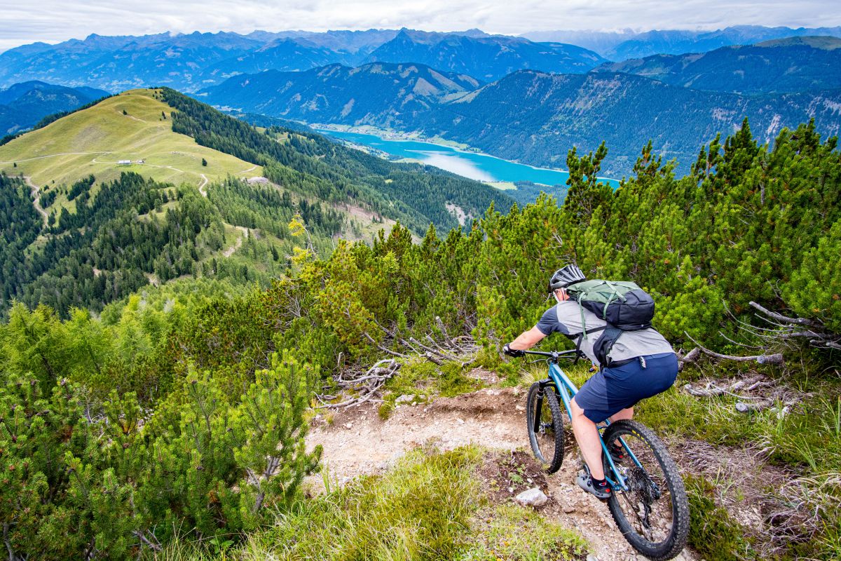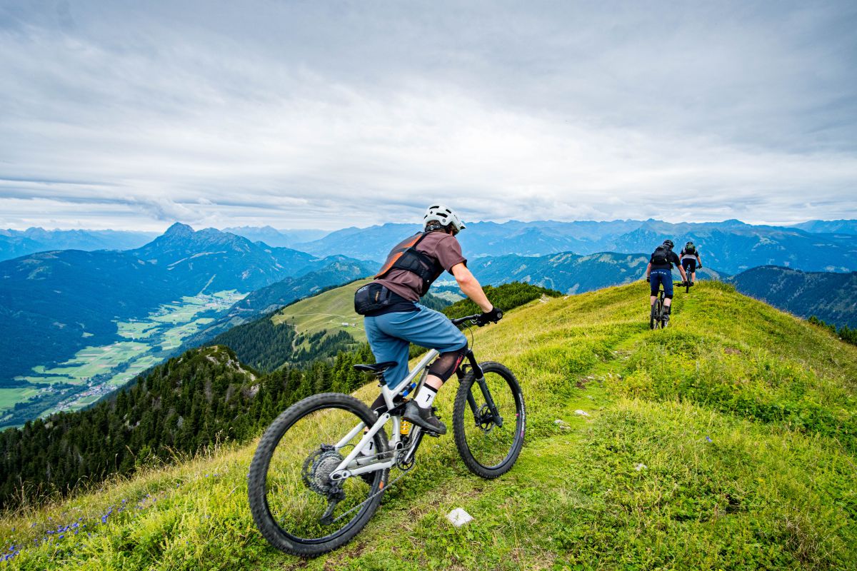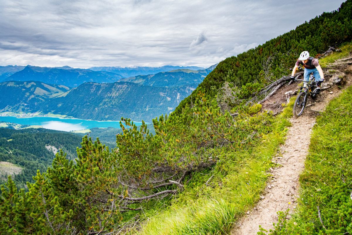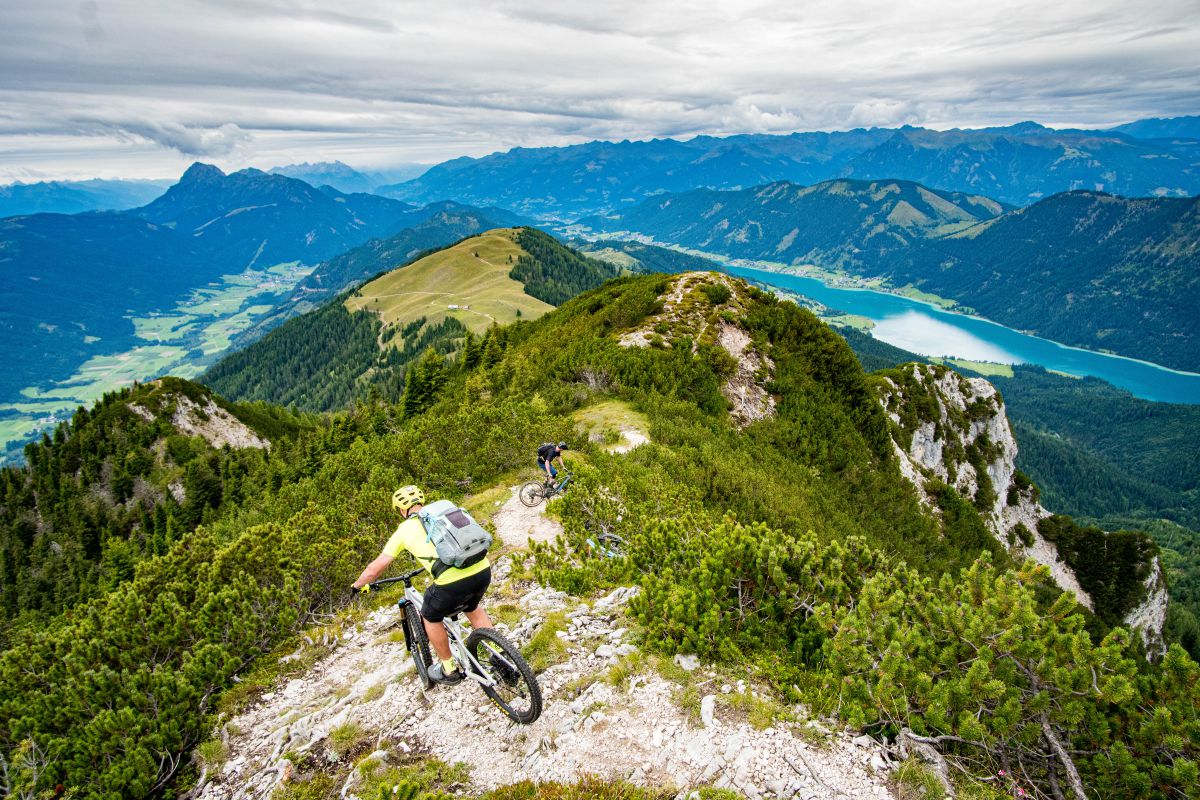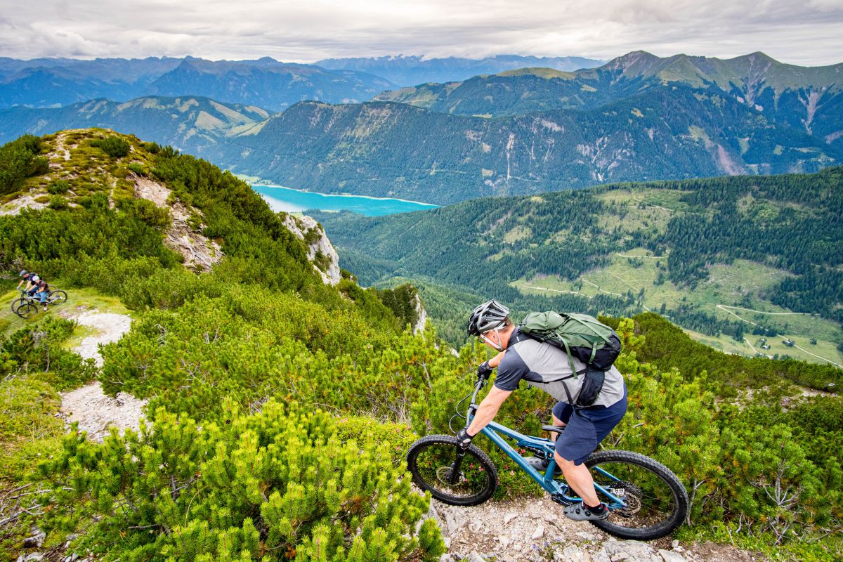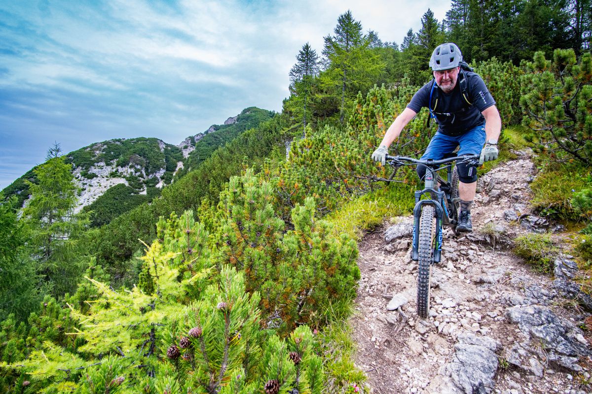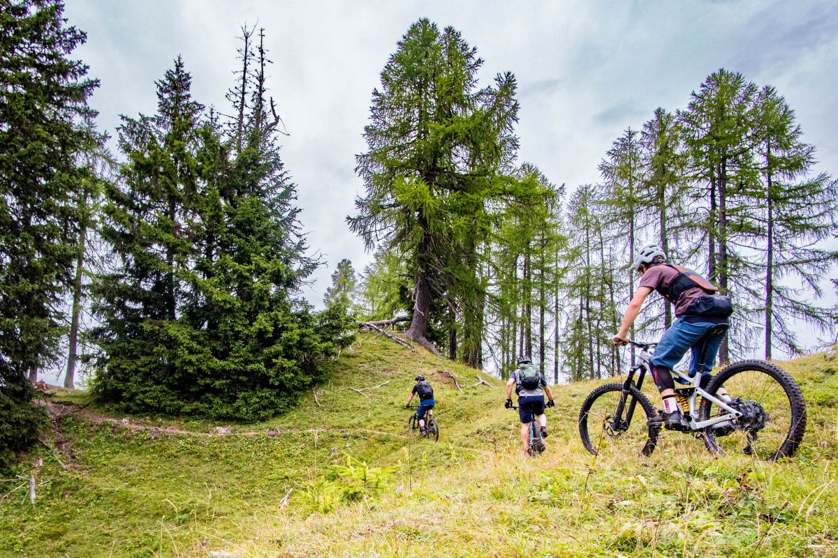 Bei dieser Bikebergsteigen light Tour nutzen wir zuerst einen Lift mit Biketransport, danach traten wir fleißig in die Pedale und schlussendlich mussten wir unsere Mountainbikes schultern. Soweit so geplant. Bei der Tragepassage auf den Gipfel entpuppten sich einige Stellen als sehr steil. Kondition und Trittsicherheit mit den Bikes auf den Schultern waren gefragt. Auch ein umgefallener Baum quer über den Weg hat uns aber nicht aufgehalten und wir meisterten dies gemeinsam. Alle Wanderer die wir getroffen haben waren sehr interessiert an uns und neugierig, was wir da eigentlich machten und wünschten uns alles Gute.